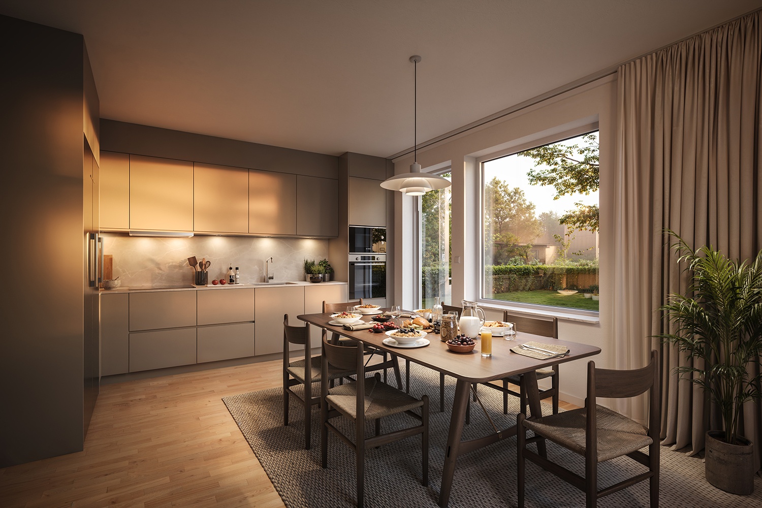 Kök med allt du behöver: inbyggnadsugn, mikro, induktionshäll, kyl/frys och diskmaskin. En generös plats för ett stort matbord och gott om förvaring för ett organiserat hem.