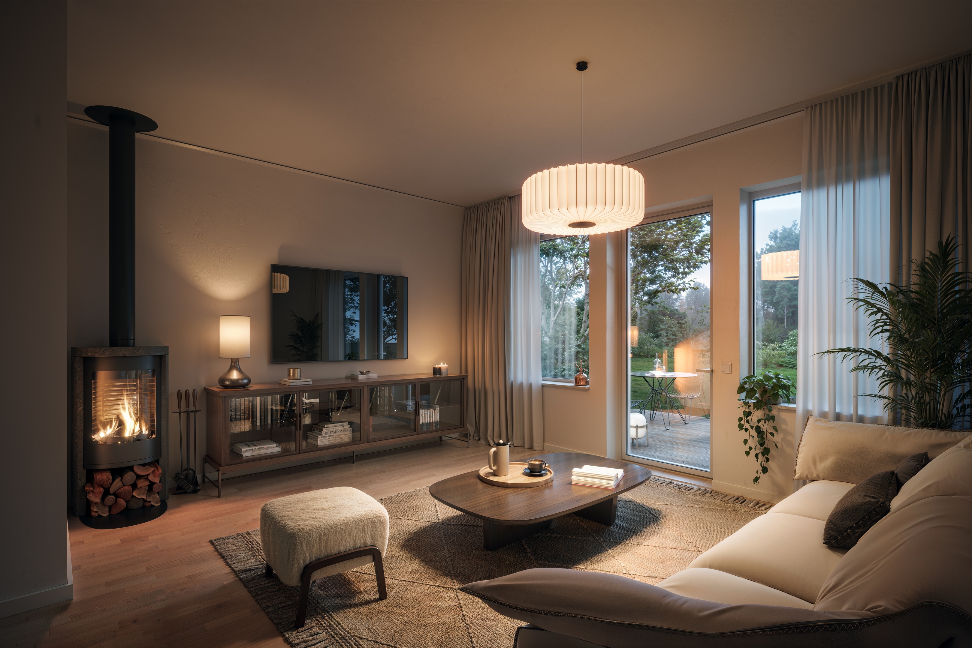 Vardagsrum med mysig braskamin – perfekt för kalla kvällar och trevligt umgänge.