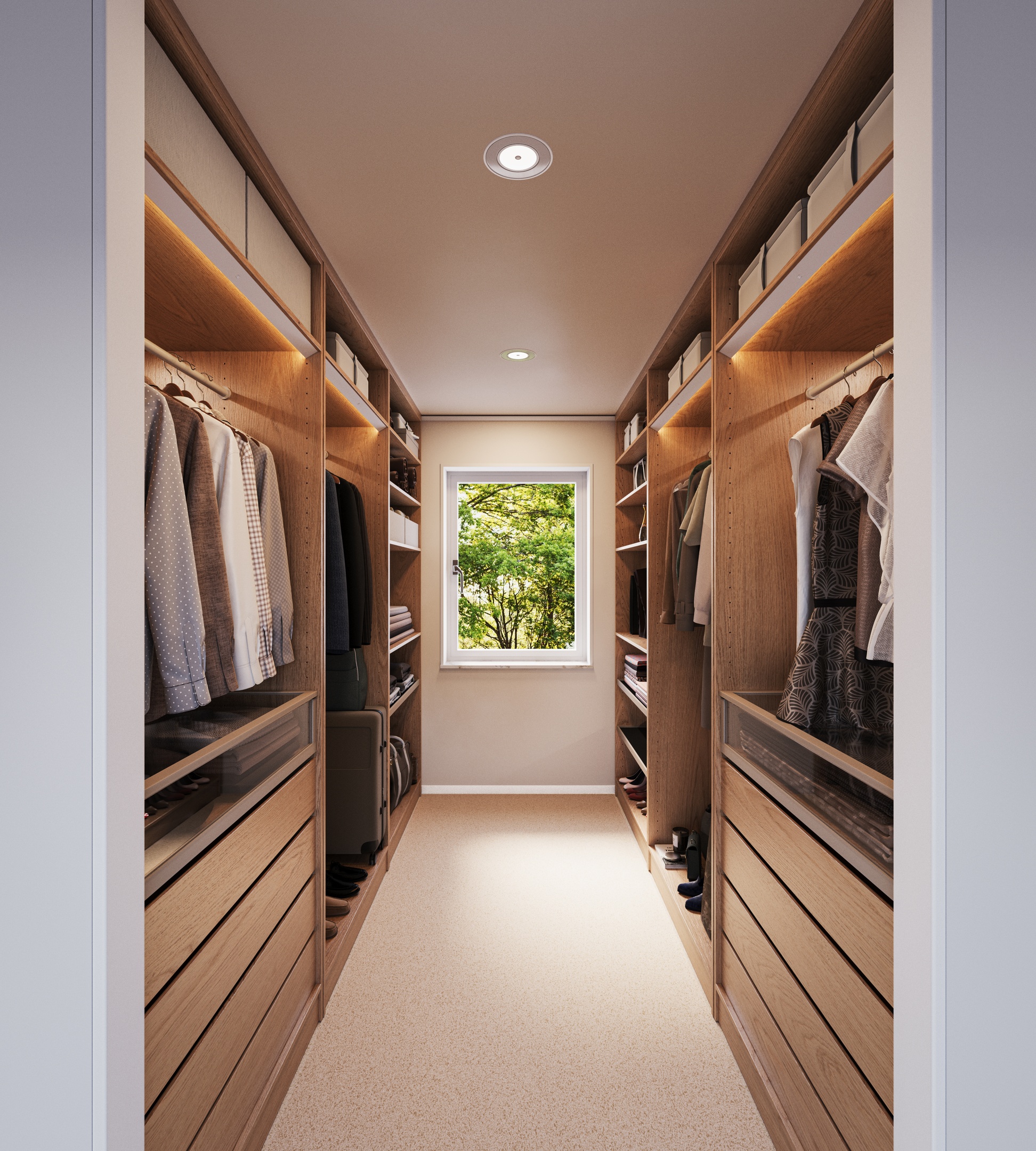 Walk in closet med smart ekmönstrad förvaring.