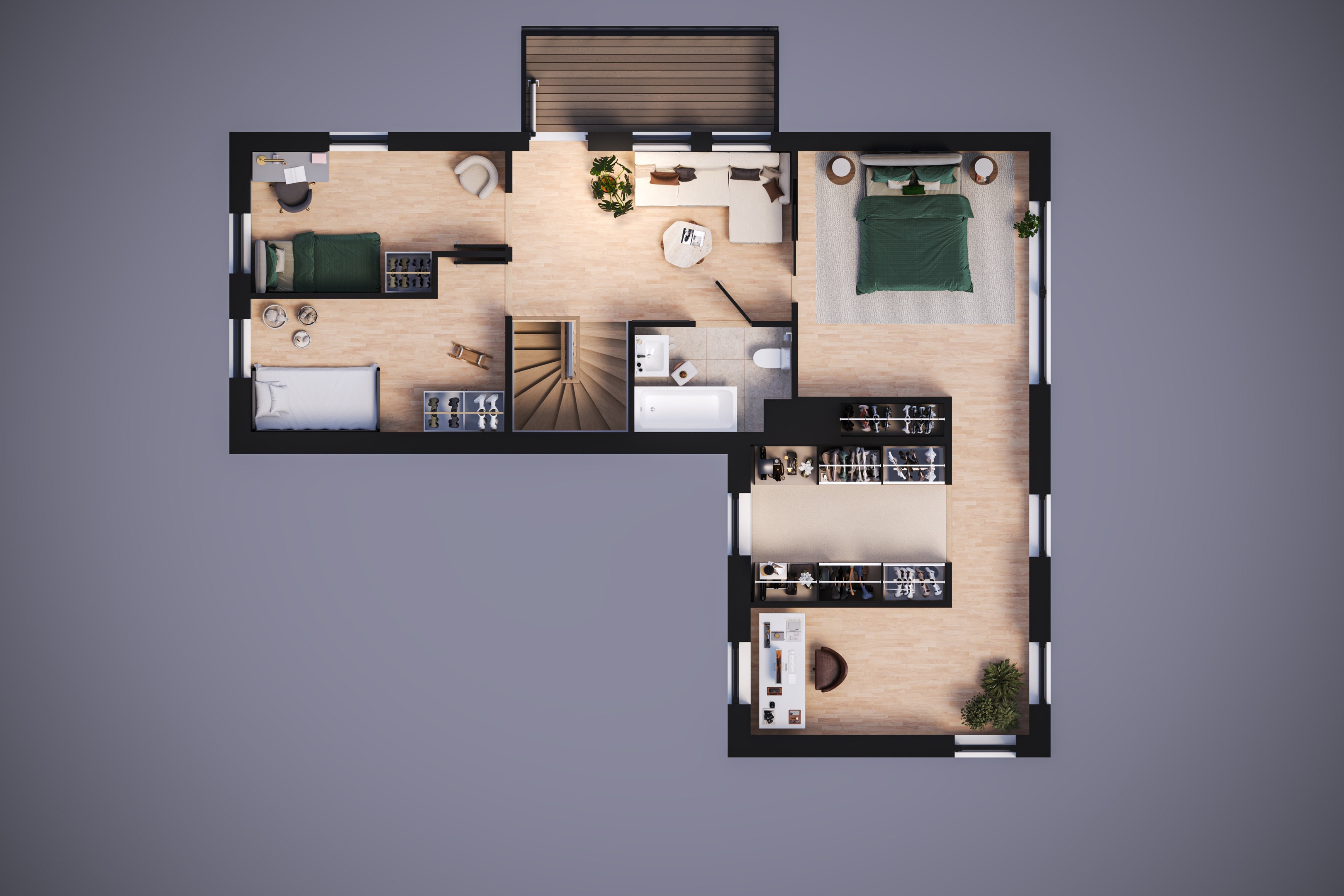 Som kronan på verket finns en rymlig walk-in-closet, din personliga oas för kläder och accessoarer. Ett rum som andas lyx och ordning, där varje detalj är genomtänkt för att ge dig en garderobsmiljö utöver det vanliga.
